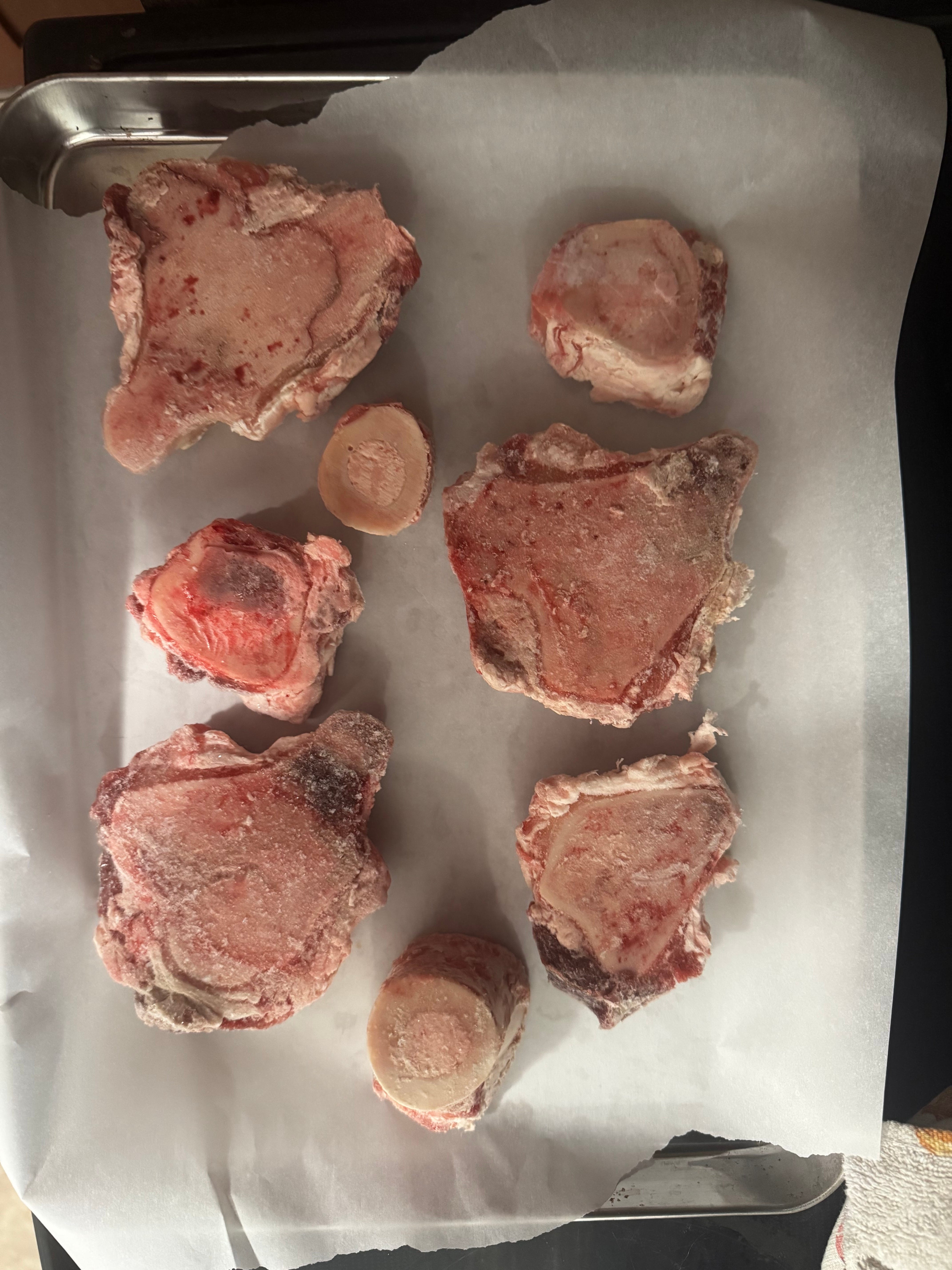For us the bone marrow comes in precut frozen packages. It’s best to get a lot of smaller bones than the bigger ones as typically there is more marrow to get from the smaller cuts.