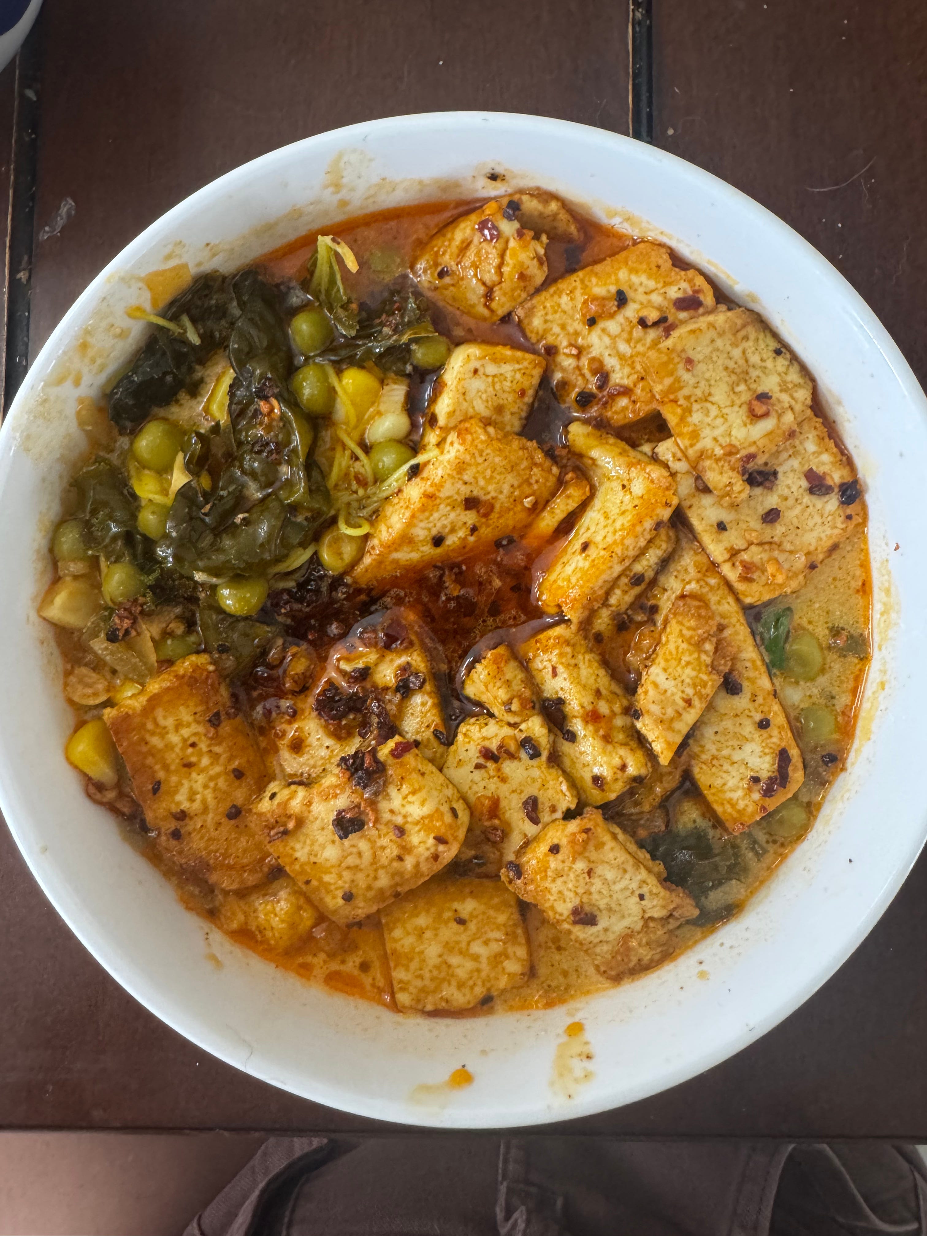 While the noodles are boiling. You want to cut about half your block of tofu. Then get some paper towels and press as much water out from the tofu as you can. After that add 1-2tsp of olive oil to a separate pan with 1tsp fish sauce. Add the sesame oil then tofu and top with a chili paste to your spice preference. Cook for about 5-10 minutes
